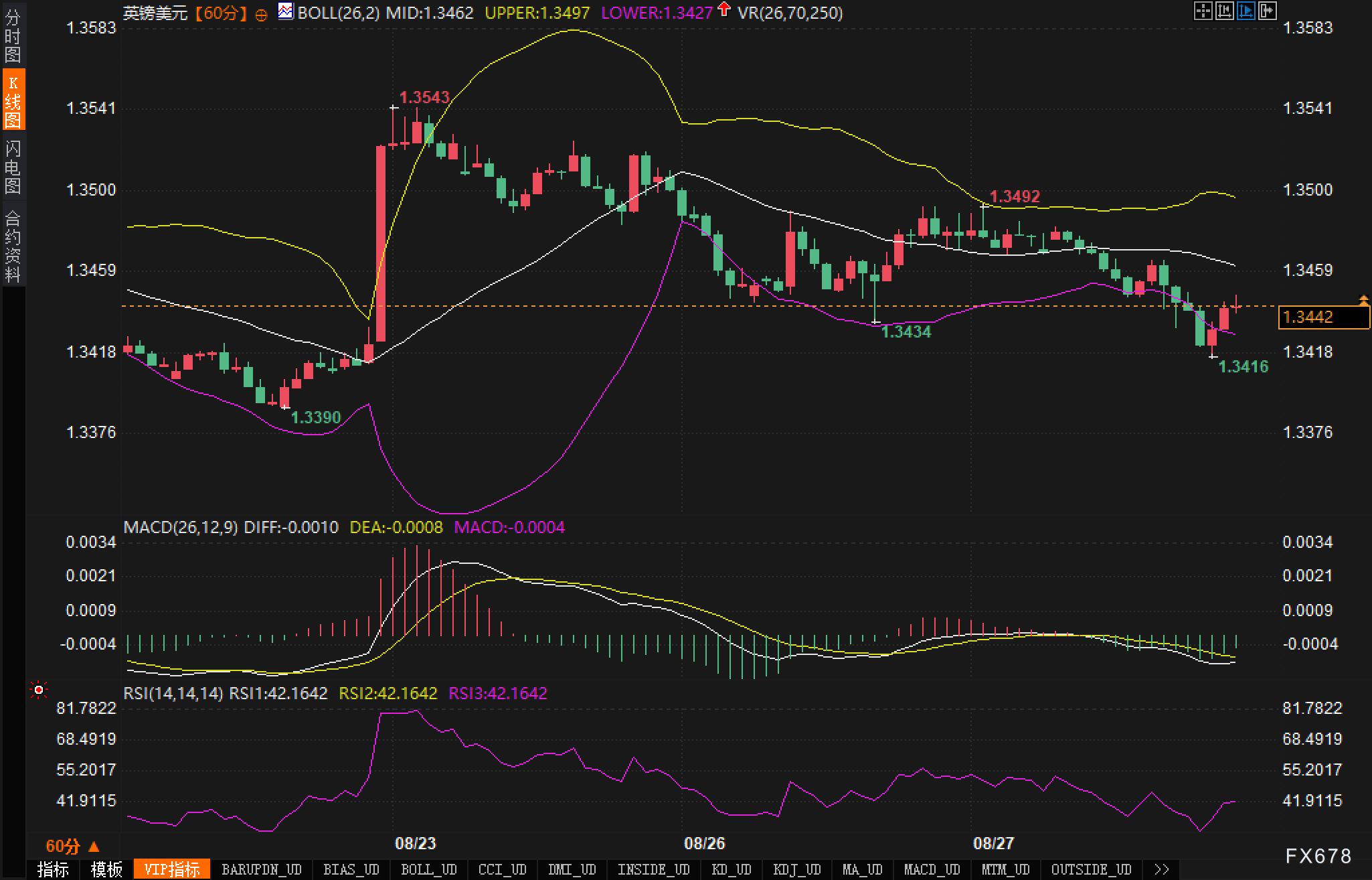 从1小时图看,英镑/美元在布林带中轨附近拉锯,布林中轨1.3462、上轨1.3497、下轨1.3427,最新价约1.3450。过去几个交易日高点逐步下移:8/23的摆动高点1.3543之后,近期在1.3492一线受阻;低点一度下探至1.3434与1.3416,但尚未有效跌破布林下轨并形成扩张。MACD显示,DIFF约-0.0010、DEA约-0.0008、柱状图约-0.0004,零轴下方略有粘合,动能偏弱但未出现单边倾斜;RSI(14)徘徊在42附近,处于中性偏弱区。