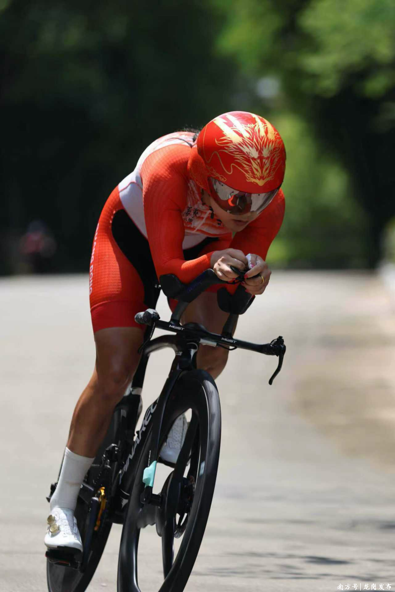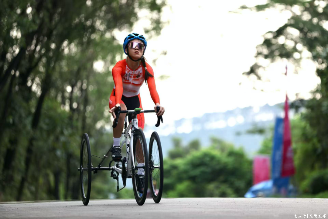 孙变变在H5女子15公里个人计时赛中卫冕冠军,作为本届自行车赛事运动员宣誓代表,曾在2024年巴黎残奥会公路自行车女子H5公路赛获得银牌。在接受采访时,她点赞自行车公路赛赛段,“龙口水库风景很美,路面也经过了重新铺设,相关设施也得到了升级改造。”她说:“手摇车难点在于需要较强上肢、核心力量,比赛更具挑战性。然而,夺取金牌的坚定信念一直在激励自己,加上前期有充分备战,夺冠显得相对轻松”。